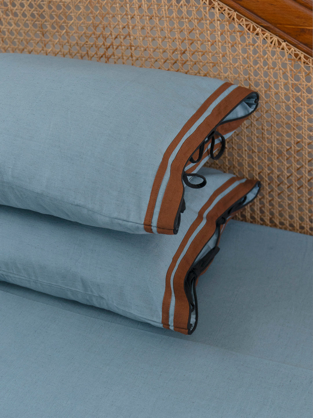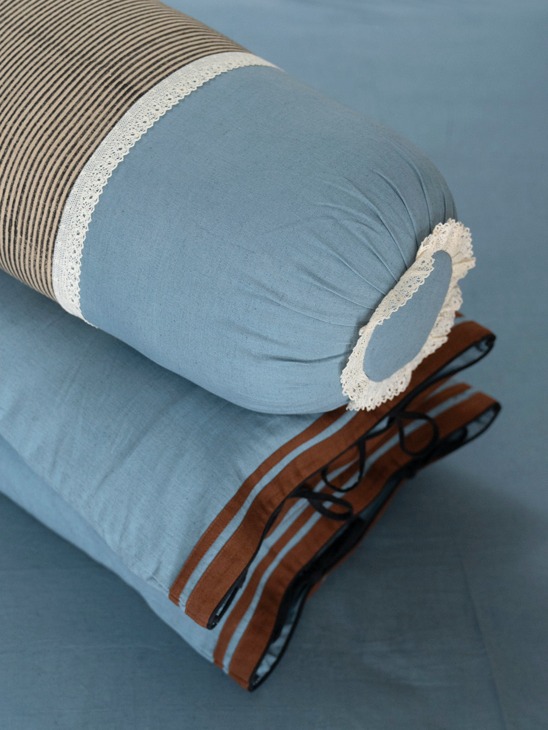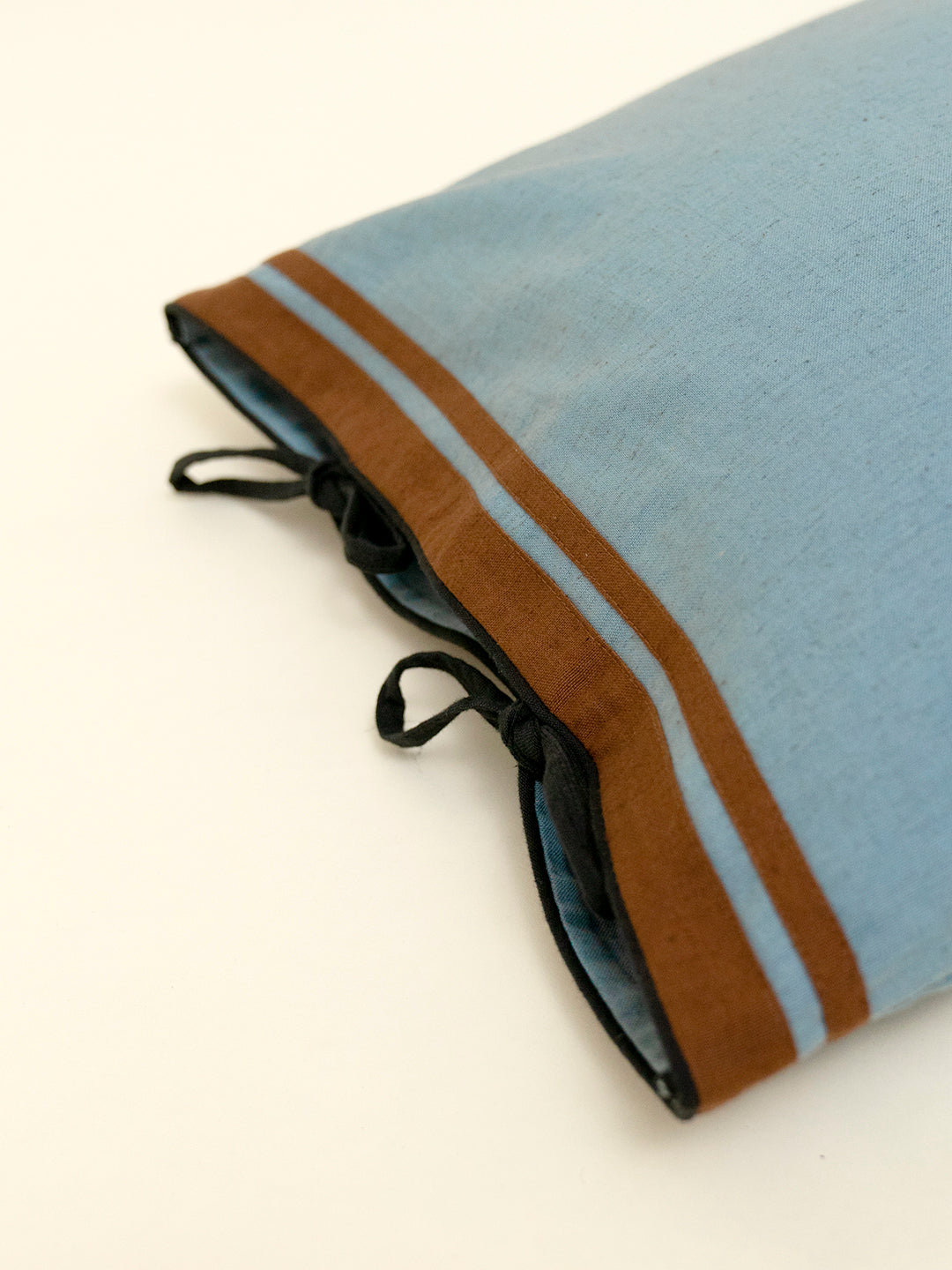 Our Garwar pillow cover is made in humble cotton flex and hand dyed in the colour Barish. It features patched accents of Chaal and Koyala tie ups, adding a subtle contrast and character to the design.