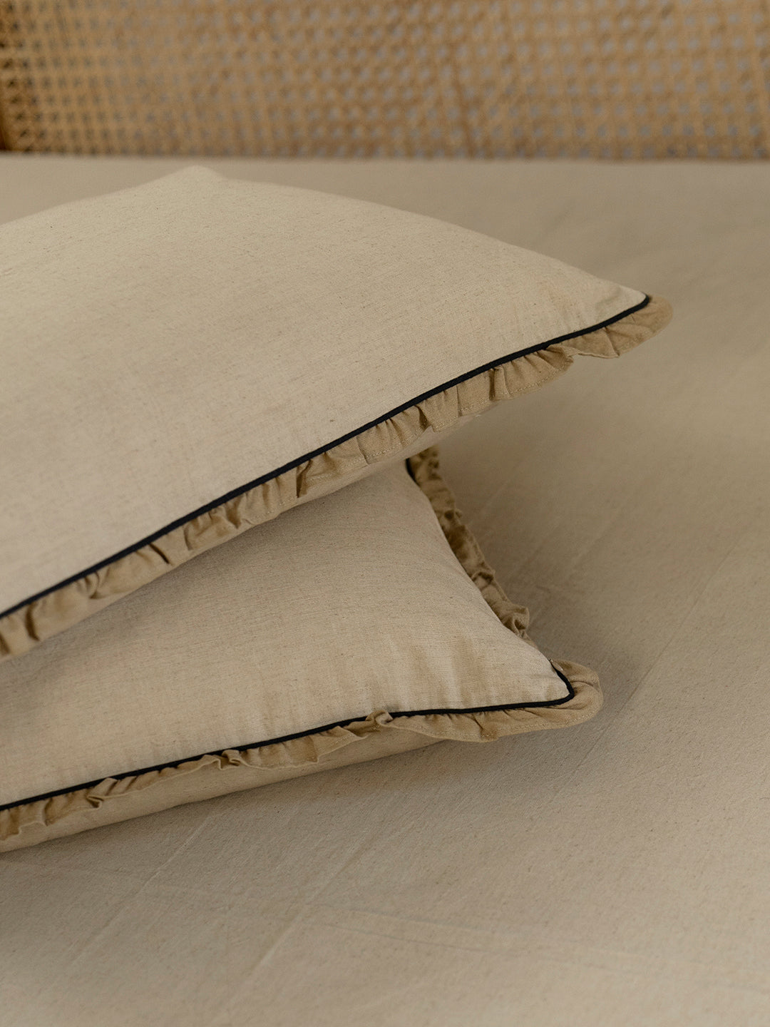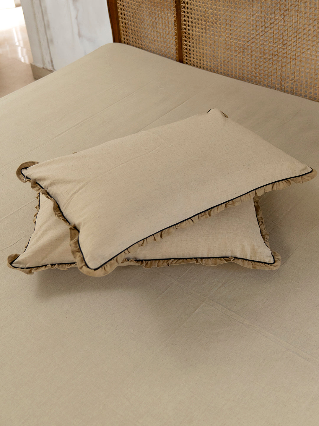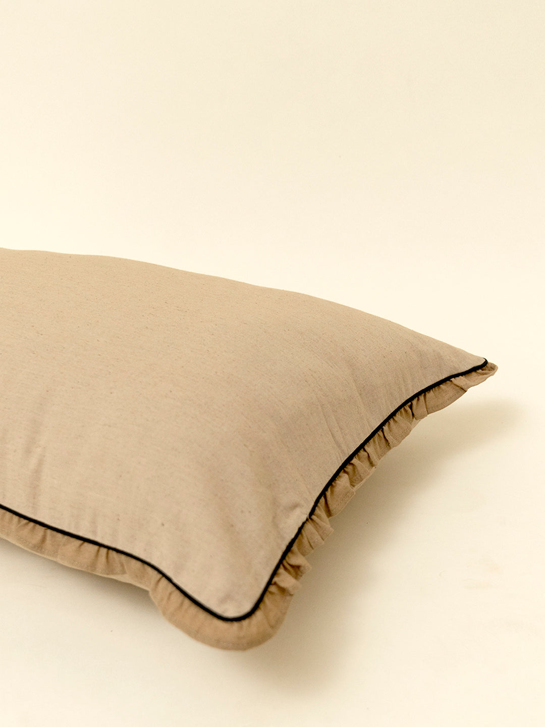 Our Narhi pillow cover is made in humble cotton flex and hand dyed in the colour Baalu. It features highlights of Koyala piping with Mittee coloured gathered frills, adding softness and character to the design.