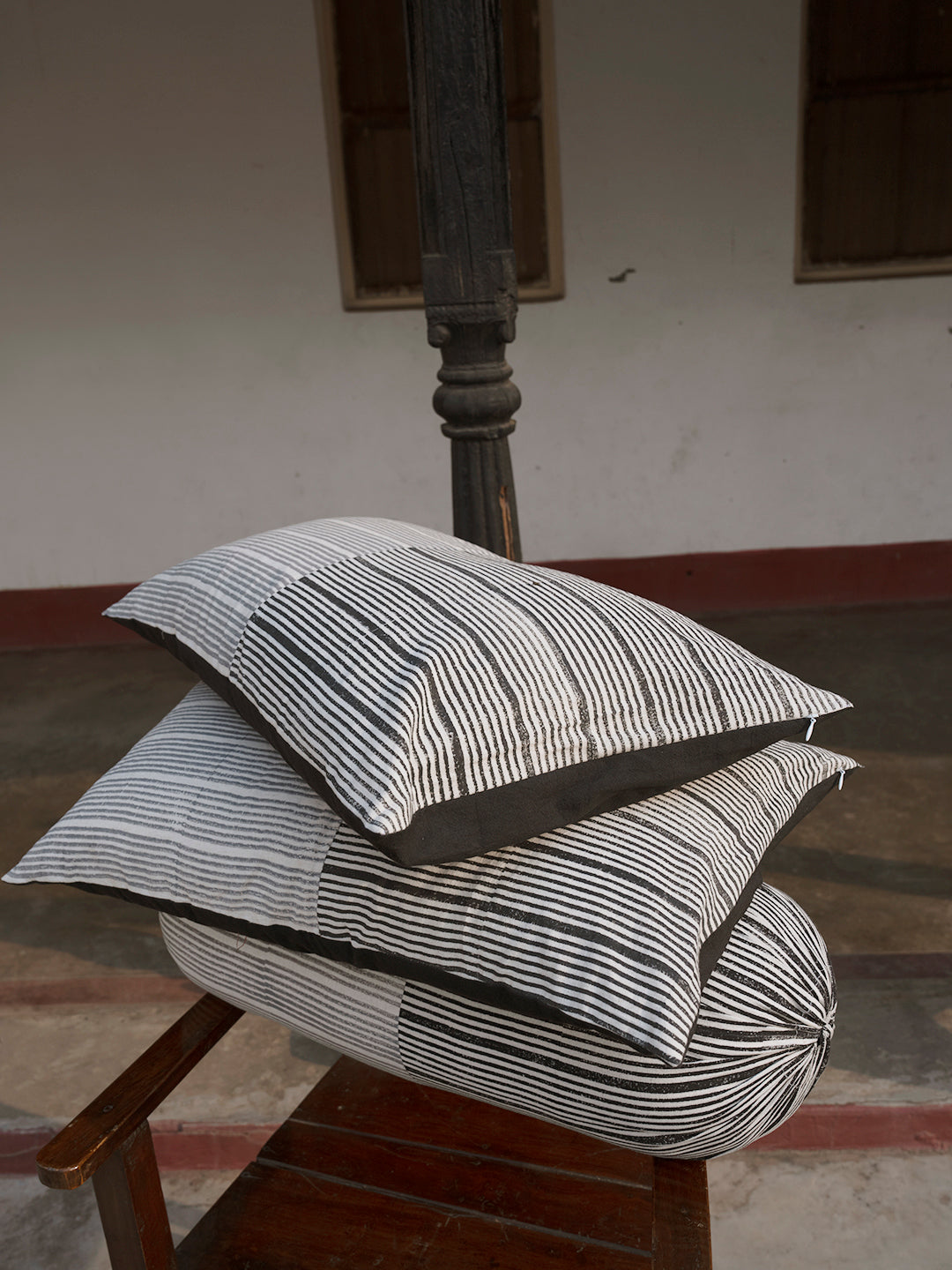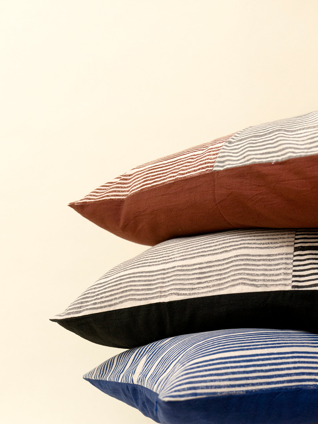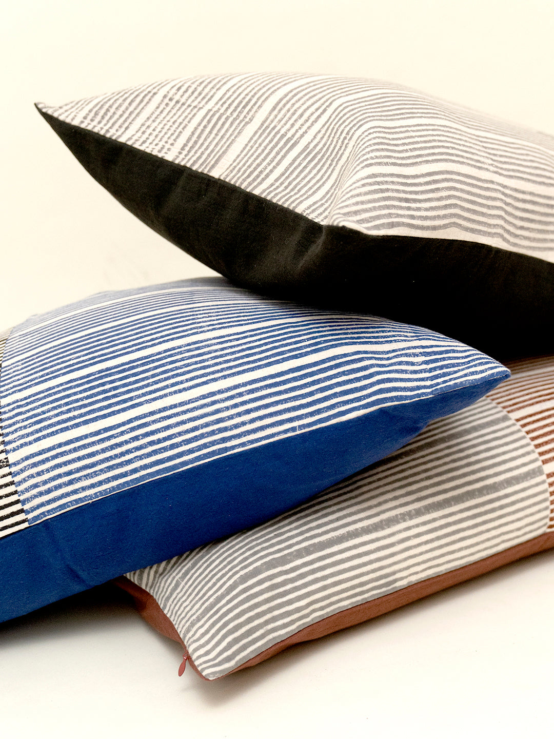 Our Phephana pillow cover is a simple yet bold composition of lines printed using hand carved wooden blocks on humble cotton. It is perfect for adding colour and texture to your quiet corners.