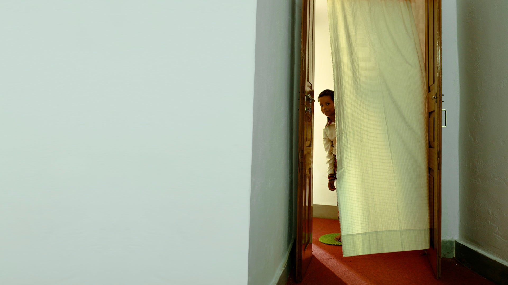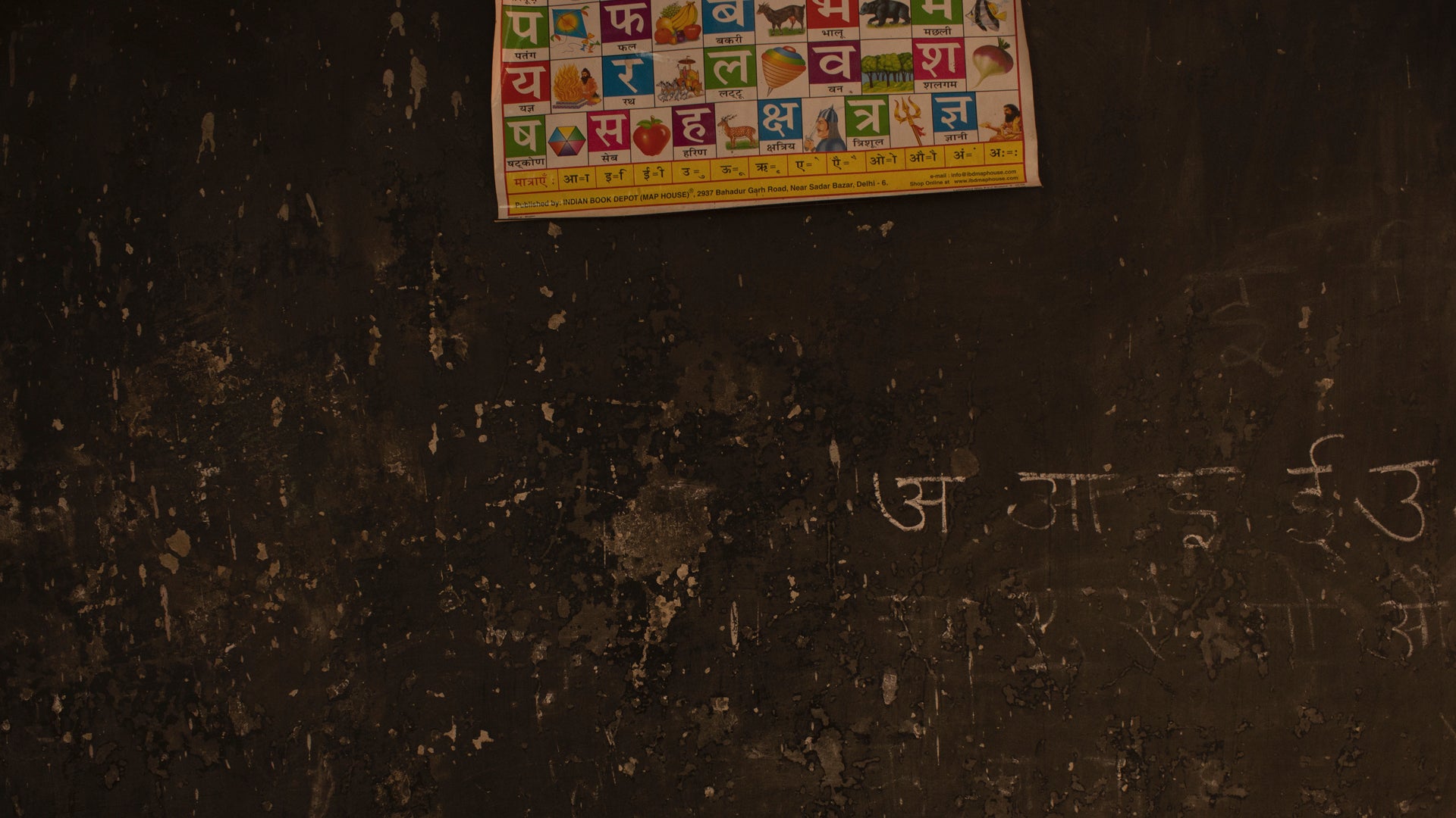 Spaces with accents of contrast bold lines, A play on negative space with bricks, Rough white lines and motifs drawn with fingers on walls which tell the stories of its inhabitants.